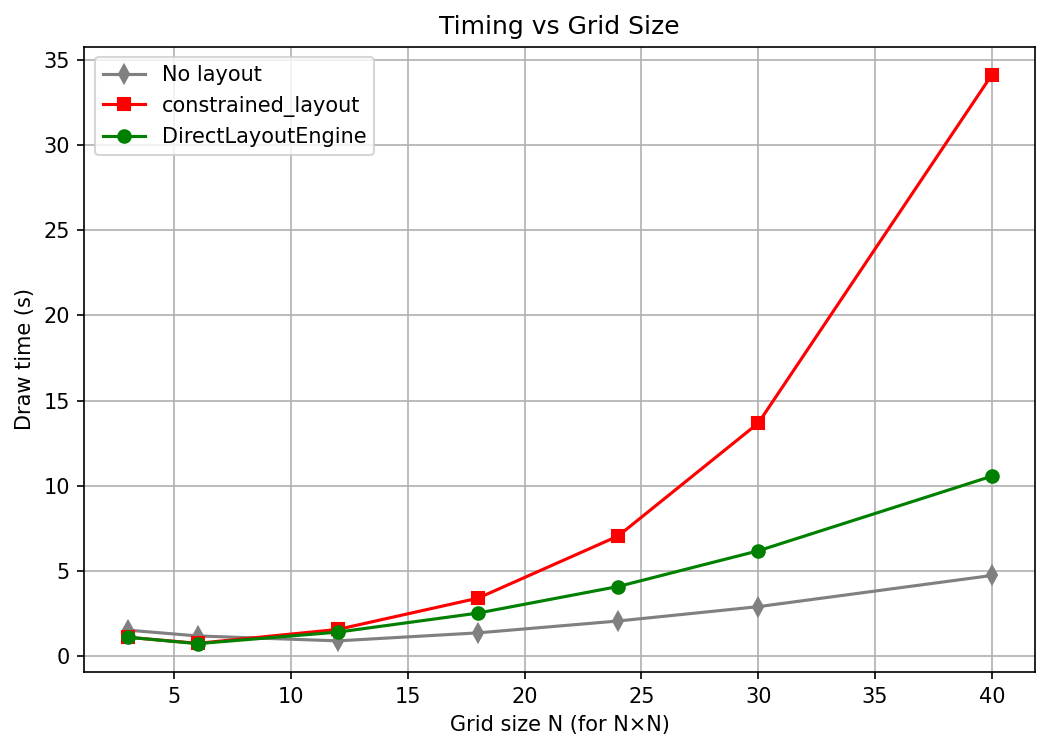 Timing and peak memory usage for DirectLayoutEngine vs constrained_layout on grids up to 30×30 axes. (See benchmark_timing_memory.txt for system details.)